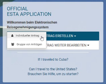 Ihr habt schon begonnen, einen ESTA-Antrag auszufüllen? Dann wählt „Bestehenden Antrag weiter bearbeiten“.