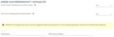 Beantwortet die Frage nach anderer Staatsbürgerschaft / Nationalität und gebt Eure E-Mail-Adresse ein.