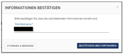 Bestätigt ein weiteres Mal, dass Familienname, Vorname, Passnummer und Geburtsdatum korrekt sind.