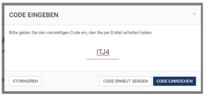 Gebt den vierstelligen Code, den Ihr per E-Mail erhalten habt, im folgenden Fenster ein und bestätigt die Eingabe mit „Code einreichen“.