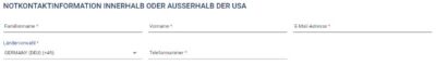 Anschließend gebt Ihr noch die Notkontaktinformationen (Notfallkontakt) innerhalb oder außerhalb der USA an.