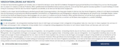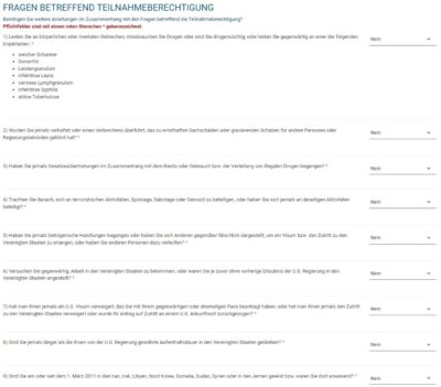 Denn hier wird abgefragt, ob Ihr ein Sicherheitsrisiko für die USA darstellt. Und die Beantwortung von nur einer Frage mit Ja kann – und wird in der Regel auch – zur Ablehnung des Antrages führen.