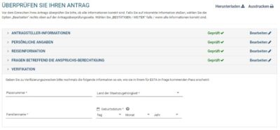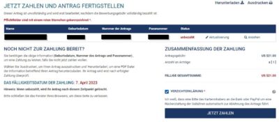 Jetzt nur noch zahlen (Kreditkarte oder PayPal), den Antrag fertigstellen und die ESTA- Antragsnummer notieren.